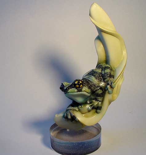 '07製作〜DATA〜 分類/アマガエル科ドクアマガエル属 学名/Phrynohyas resinifictrix 分布/エクアドル、スリナム、ブラジル北部、 フレンチギアナ、ブラジル北部… 全長/7〜10cm 〜NOTE〜 そんなに思い入れがないカエルだからここまで遊 べたのかも…と後になって思う。 でも作ってみてすごく好いカエルだなぁ…って思った。 最近イキモノのフィギュアに対して、リアルである 必要性をあんまり感じなくなってきた。 そんな気持ちで作ったのがコレ。 唐草模様とかが彫り込んであったり、目玉の黒目や 十字模様にもモールドが入っていたりなど、リアル というところからちょっと離れた視点で仕上げてみ ました。 |